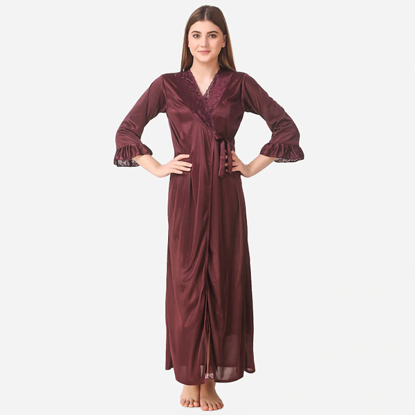 Brown Maxi Satin Solid Nightwear Set