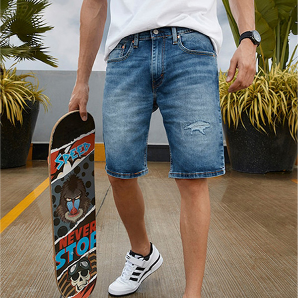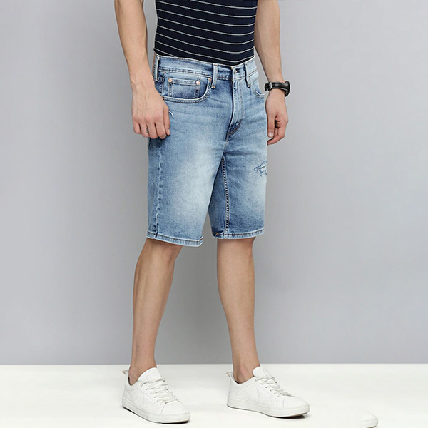 Blue washed mid-rise distressed denim shorts, has 5 pockets, button closure