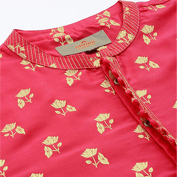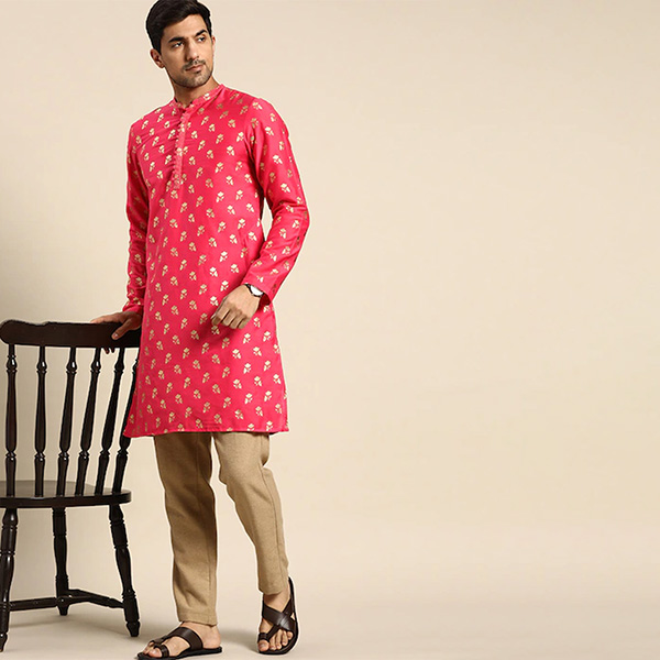 Men Magenta Pink & Golden Floral Printed Thread Work Floral Kurta