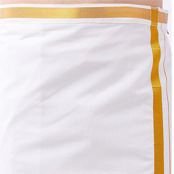 White solid mid-rise dhoti with gold boarder has a velcro closure, one pocket and belt loop