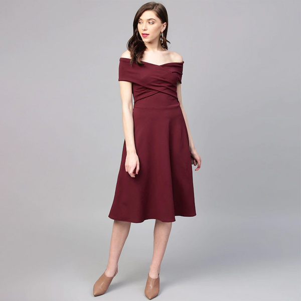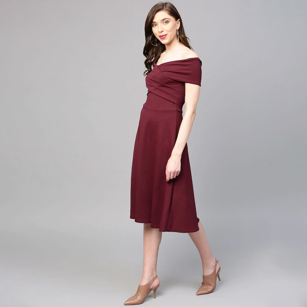 Burgundy Off-Shoulder Pleated Fit & Flare Dress