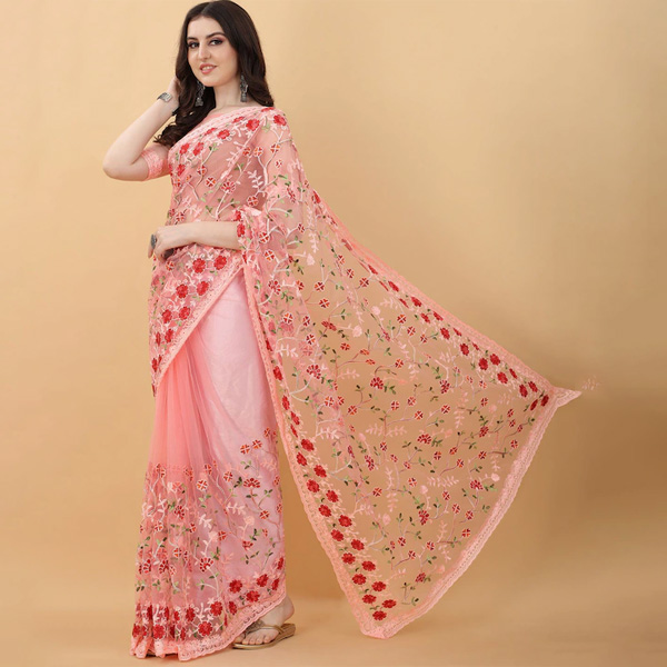 Pink & Red Floral Embroidered Net Heavy Work Saree