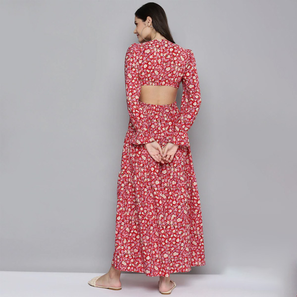 Red & Beige Floral Waist Cut-Out Maxi Dress