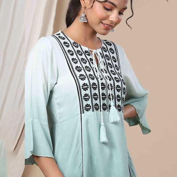 Green and black embroidered tunic ,has a round neck, three-quarter sleeves, tie-ups detail,ombre detail