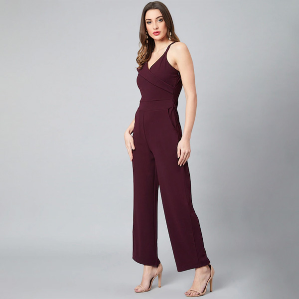 Burgundy solid basic jumpsuit, has a shoulder straps, sleeveless