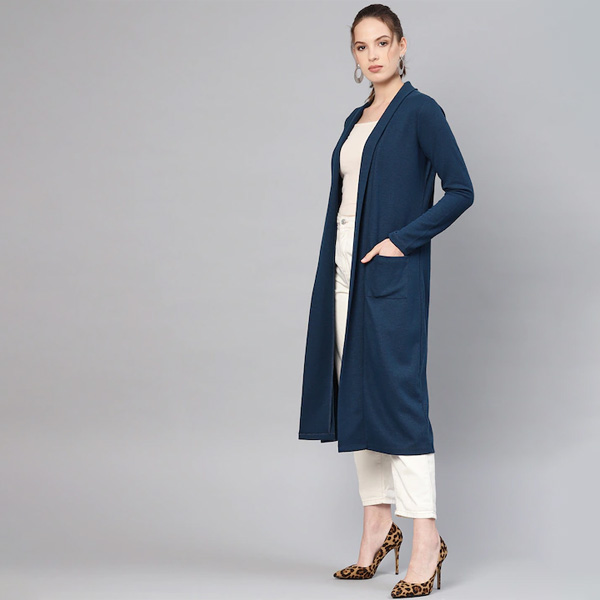 Women Teal Blue Longline Solid Open Front Winter Shrug