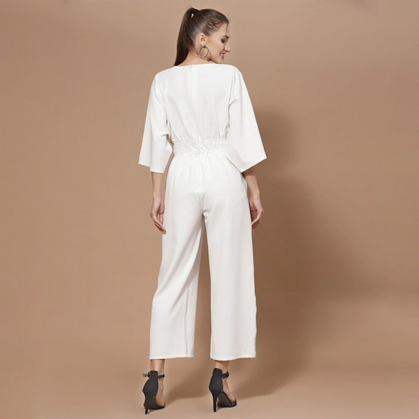 White solid basic jumpsuit ,has a v-neck, three-quarter sleeves, 2 pockets